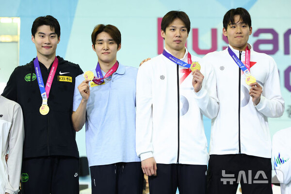 뉴시스 보도에 따르면, 김영범, 양재훈, 김우민, 황선우 순으로 출전한 강원은 19일 부산 사직종합운동장 실내수영장에서 열린 대회 수영 계영 800m 남자 일반부 결승에서 7분12초65로 정상에 올랐다.
