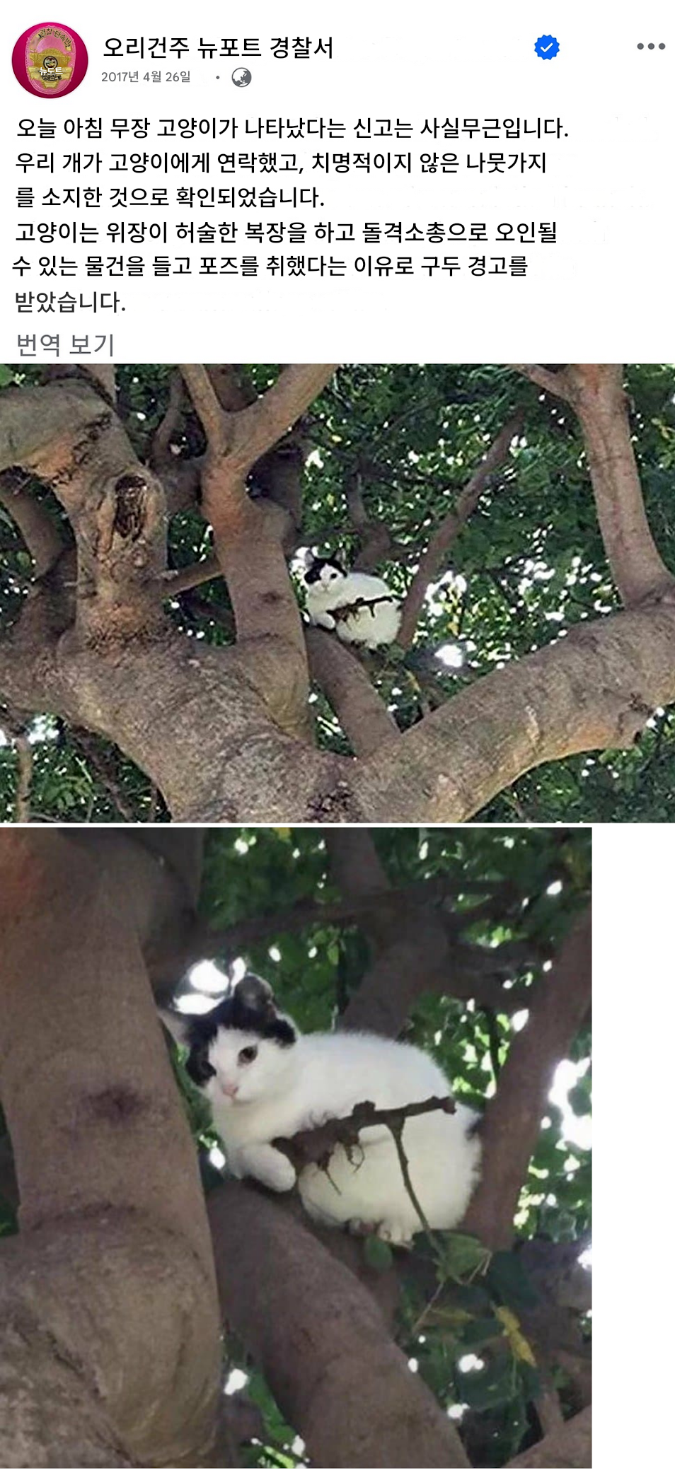 “나무 위에 소총 든 고양이가 있어요” 신고 ,,
