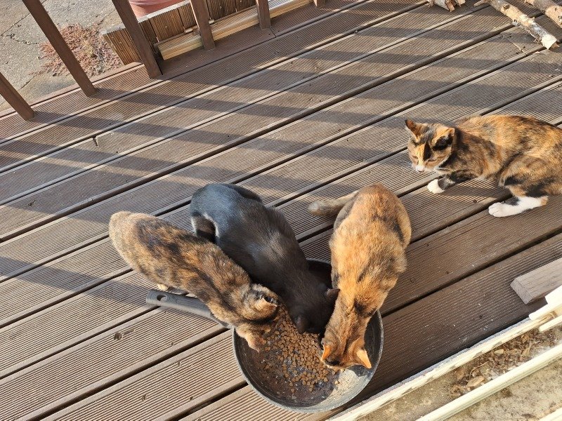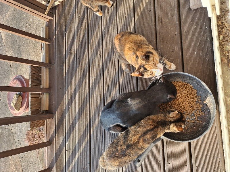 아침마다 동네 냥이들이 몰려와서 밥 달라고 냥냥댑니다.